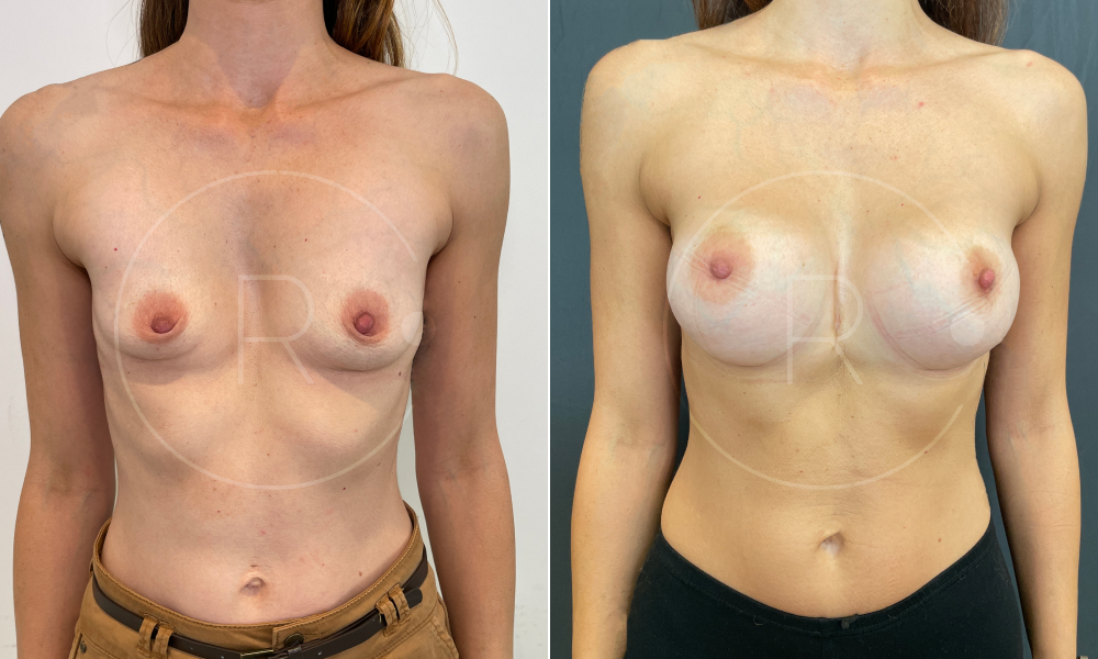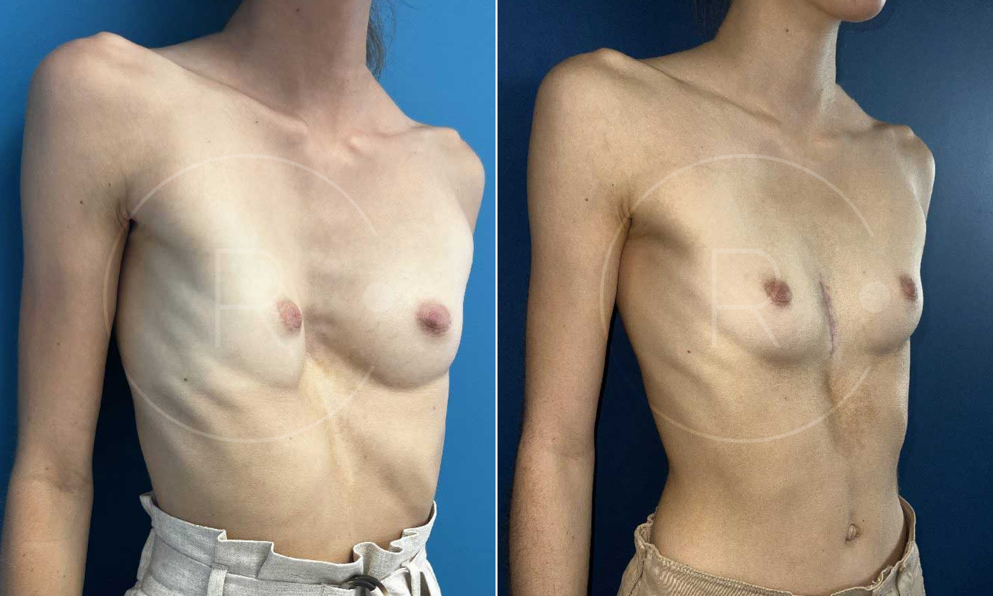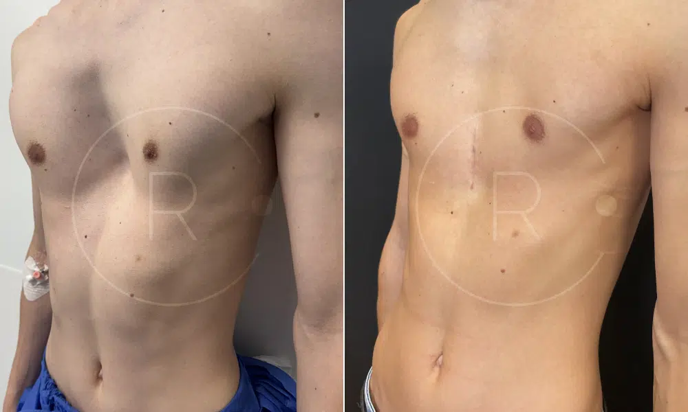 Résultat à 3 mois post opératoire de l’augmentation mammaire par prothèses et 1 an post opératoire pour la reconstruction par implant du pectus excavatum