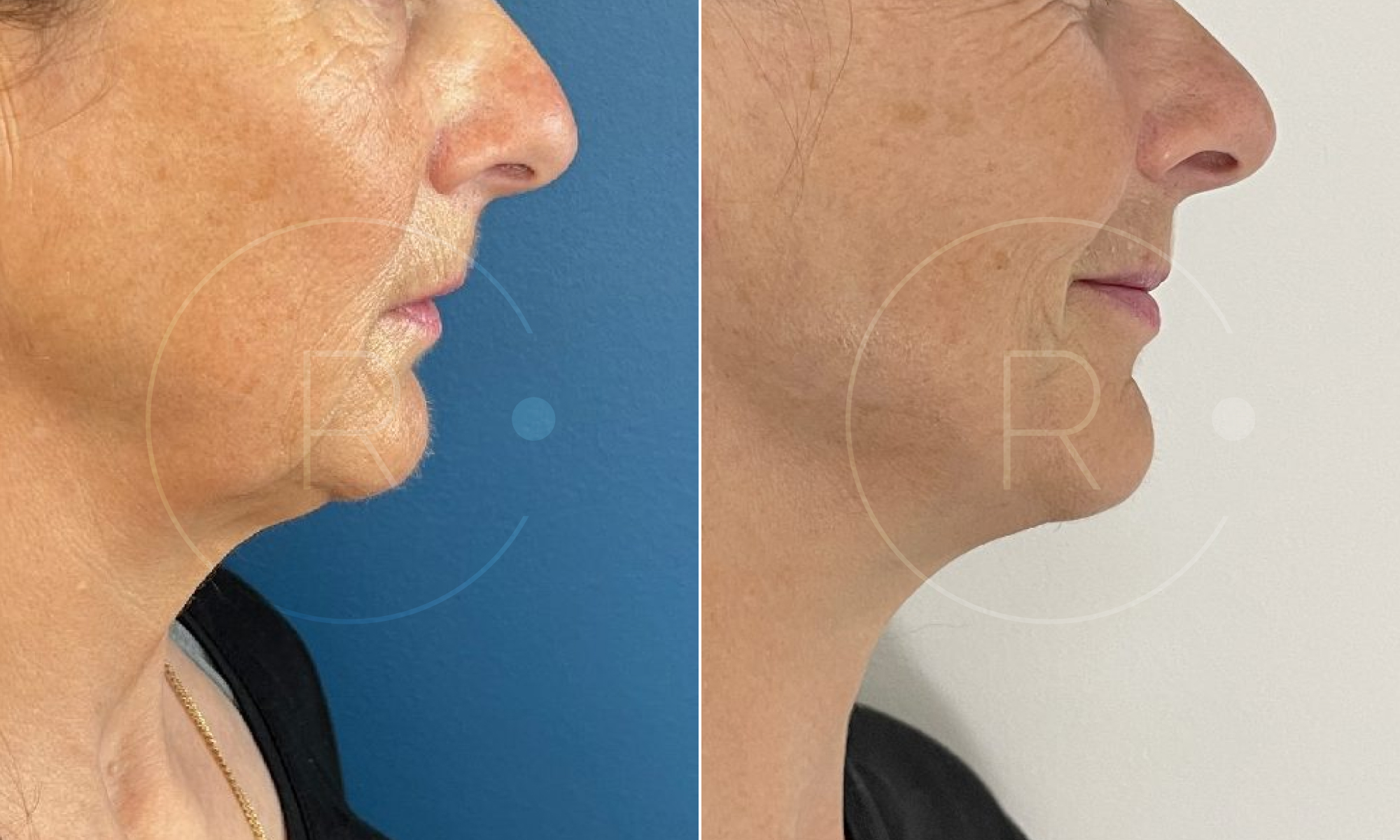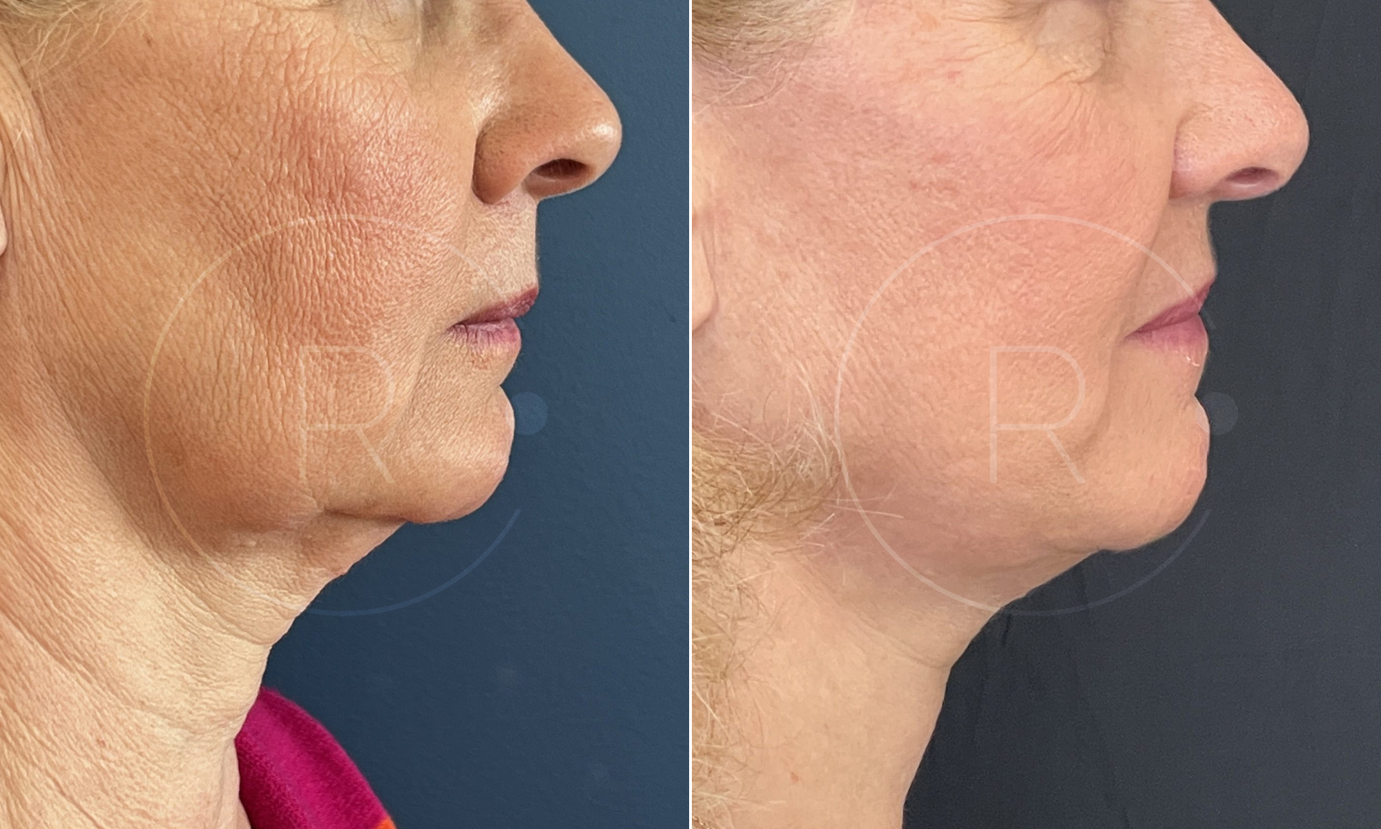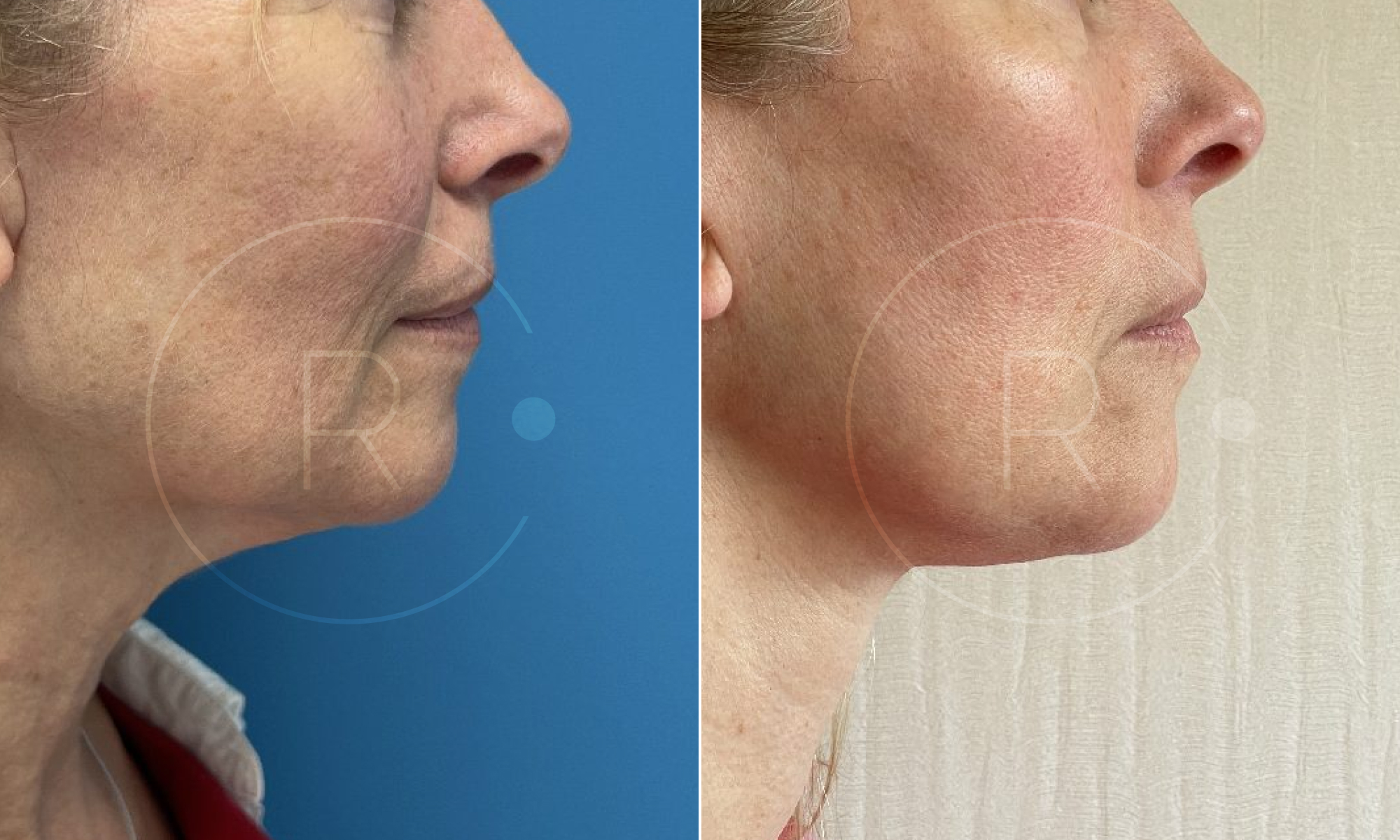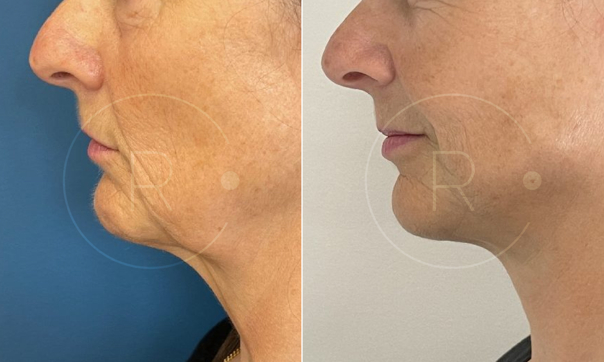 Le résultat final apparaît progressivement, une fois l’œdème résorbé. L’ovale retrouve sa netteté, les bajoues sont effacées, le cou est plus ferme et le visage semble plus frais, plus reposé, tout en restant 100 % naturel.