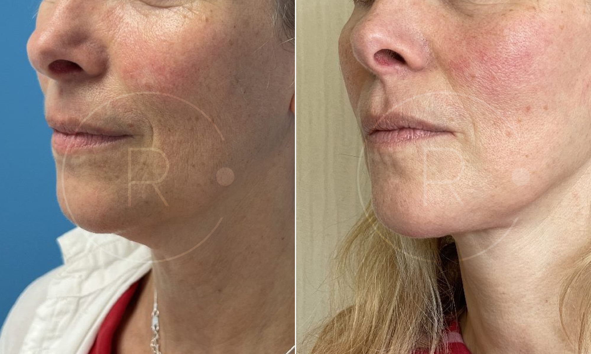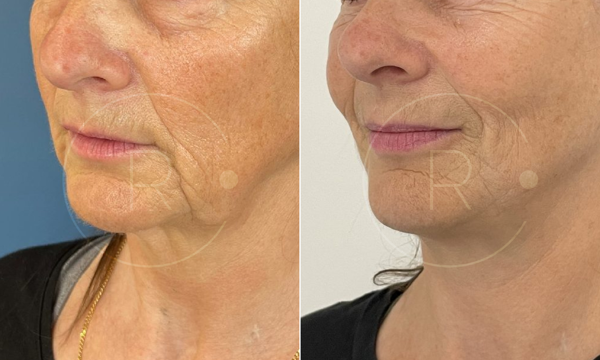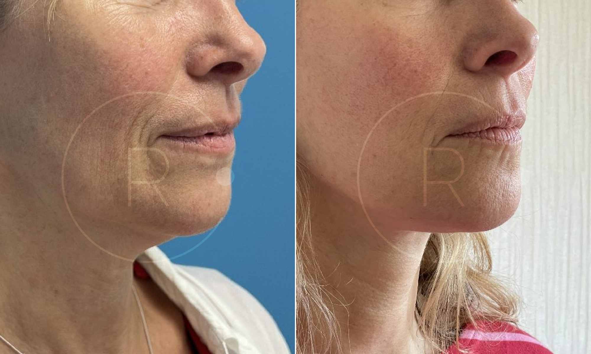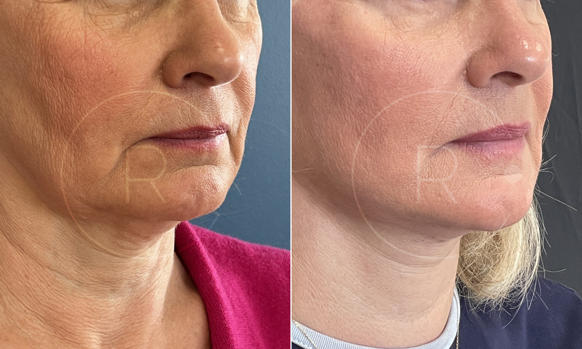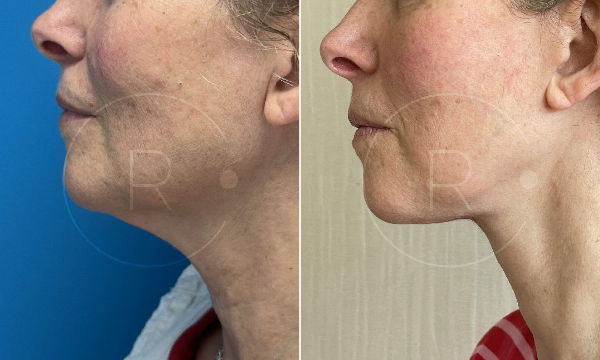 Le résultat final apparaît progressivement, une fois l’œdème résorbé. L’ovale retrouve sa netteté, les bajoues sont effacées, le cou est plus ferme et le visage semble plus frais, plus reposé, tout en restant 100 % naturel.